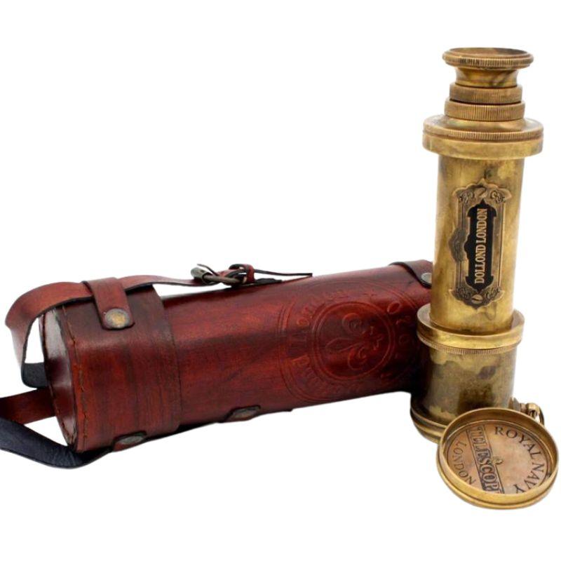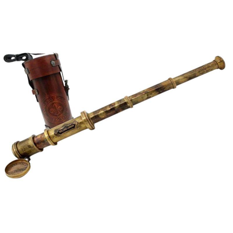 Dieses wunderschöne Antike Piraten-Fernrohr im Holzkasten wird perfekt für deine Inneneinrichtung im maritimen, piraten- oder vintage Stil sein. Das Monokular ist aus Messing gefertigt und die Tasche aus hochwertigem Leder. Ideal, um es mit einem Piratenkostüm zu kombinieren oder zu dekorieren.
