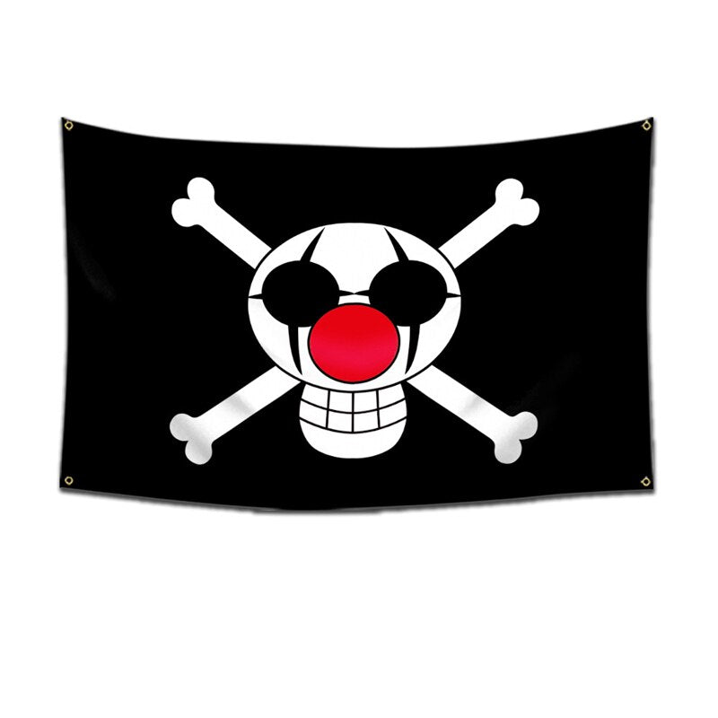 Buggy der Clown ist nicht nur für seine farbenfrohe Erscheinung und seine komischen Momente bekannt, sondern auch für seine tiefe Geschichte und Verbindung zu Gol D. Roger, dem König der Piraten. Sein Jolly Roger, das Symbol seines Piratenrufs, spiegelt seine einzigartige Persönlichkeit und seine Fähigkeiten wider, die er durch die Trenn-Trenn-Frucht erlangt hat. Diese Flagge ist nicht nur ein Symbol für Buggys Crew und seine Abenteuer, sondern auch ein Zeichen für seine unauslöschliche Präsenz in der One Piece-Welt.