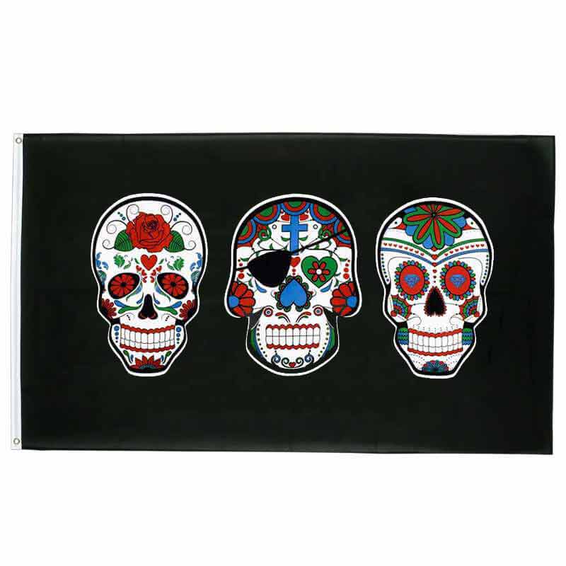 Wenn du nach einer mexikanischen Piratenflagge suchst, bist du hier genau richtig, Kamerad! Hier ist die Flagge Totenkopf Santa Muerte. Darauf sind drei wunderschöne bunte mexikanische Totenköpfe abgebildet. Wenn du farbenfrohe Flaggen magst, dann wird diese Flagge dir sicherlich gefallen!