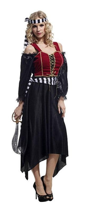 Mit diesem Kostüm zeigst du der ganzen Welt deine ruhige und einzigartige Seite. Dazu gehört auch ein Kopftuch und ein Gürtel. Beide Elemente sind in Schwarz und Weiß gehalten. Verwandle deinen Stil mit dem Piratenkostüm Schwarze Dame.