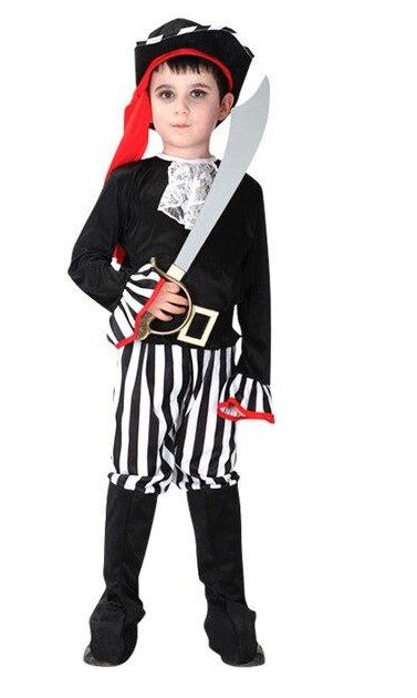 Sein Piratenhut wird ebenso prächtig sein, und er kann ihn aufsetzen, nachdem er seine Stirn mit seinem roten Stirnband gebunden hat. In seinen Piratenstiefeln kann er losziehen und Süßigkeiten sammeln. Die Nachbarn werden diesem absolut entzückenden Kostüm nicht widerstehen können.