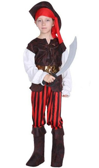 Dieses Kostüm hast du hier. Es ist ein authentisches Piratenkostüm, vom Piratenhut bis zu den Stiefeln, über das Hemd in zwei Farbtönen, Weiß und Braun, und die ebenfalls zweifarbige Hose in Rot und Schwarz. Ein goldfarbener Gürtel wird seine Taille umgürten, und er könnte ein rotes Bandana um den Kopf binden. Alles ist da, damit dein Sohn seine Piraterie erlebt.