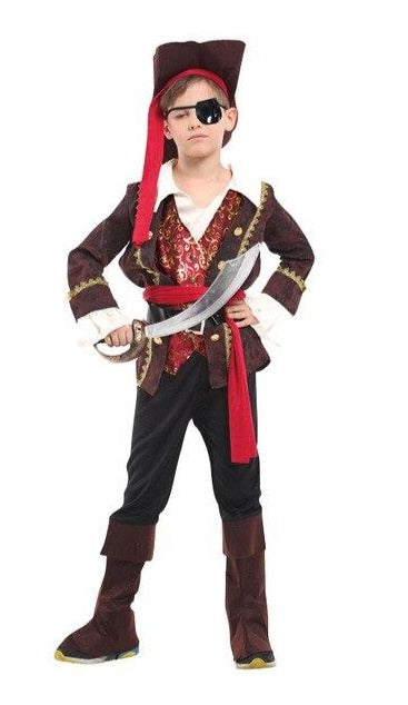 Ein komplettes Kostüm : Braune Stiefel, schwarze Hose, weißes Langarmhemd, eine gut verzierte rote Weste und ein brauner Anzug, verziert mit Spitzen, ein rotes Stirnband an der Taille und ein ebenfalls rotes Bandana auf dem Kopf, gekrönt von einem braunen Piratenhut und schließlich einer Augenklappe - das ist die komplette Zusammenstellung eines Kostüms, das eines Schiffskapitäns würdig ist.